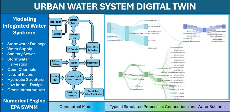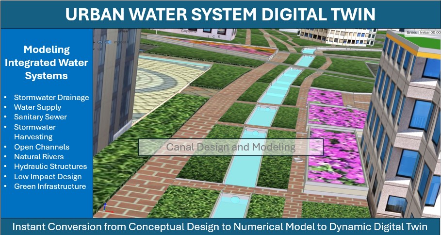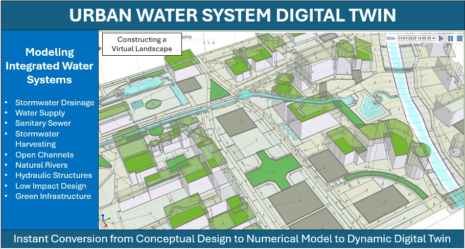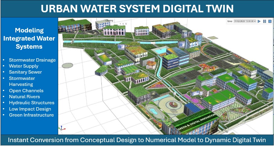 Figure 1: Introducing M4W-StormNET - a next-generation Digital Twin modeling technology for urban water systems. Stormnet enables high-fidelity simulation and visualization of urban water distribution and water drainage systems, green infrastructure and low-impact design, and flood inundation and river system dynamics.