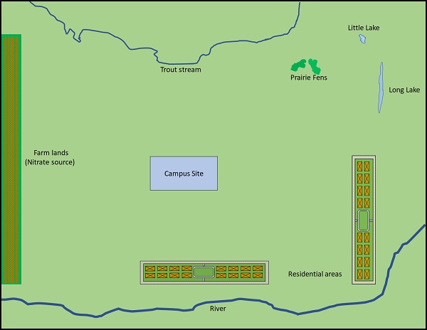 You have been hired by a developer to help with the design of a major development complex. The proposed development site, which totals 73.3 acres, sits within a small catchment with a creek that drains into an ecologically important stream at the outlet of the catchment. There is also an existing housing development southeast of proposed development. Because of the water-quality limited designation of the stream, the developer needs to design a storm water system that will minimize the impact on it. One approach is to collect and route stormwater to wetlands adjacent to the development site for natural infiltration into the groundwater system. Another idea is to route storm water through a storm-sewer network and a holding pond to attenuate the flow into the stream and allow for settling of large particulates. Your objective is to determine the feasibility of the two approaches, given the constraints related to streamflow and water table in the area of the existing development.