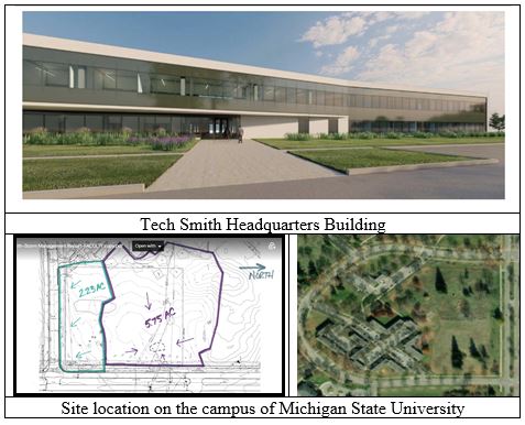 You are hired to analyze (and improve upon) a preliminary design for a stormwater management system for the proposed Tech Smith headquarters to be located on the Michigan State University campus in East Lansing, Michigan . Stormwater captured by buildings, sidewalks and other paved areas is to be conveyed to an on-site holding pond through a proposed system of junctions (manholes) and conduits (pipes). Using both spreadsheet approaches and a sophisticated simulation software – MAGNET StormNET - you will design (and then refine) the pipes (including their sizes, slopes, and roughness) and a holding pond (total volume, dimensions, and outflow control structures). You will also assess potential impact of Low Impact Development (LID) controls or other green infrastructure integrated into the system.