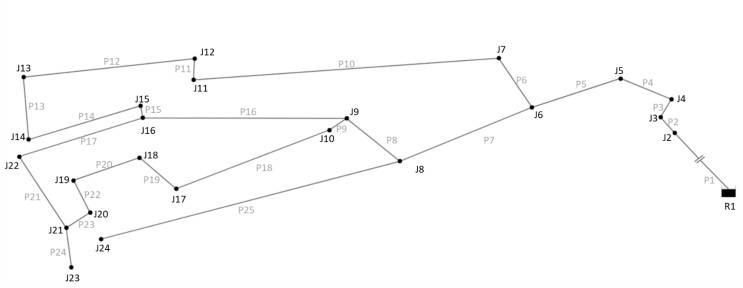 A small (but quickly growing community) relies on groundwater to meet its water needs. But over pumping of the aquifer is causing deeper, highly mineralized groundwater to migrate to the shallow subsurface, contaminating the local supply. The community has decided to switch to surface water supply and needs to build a drinking water distribution system that must satisfy certain requirements. The community’s Development Company provided a preliminary design of the distribution system, but the community would like an external review of the design before proceeding with construction. You have been hired analyze the hydraulic feasibility of the preliminary design, particularly with respect to minimum pressure and flow velocity requirements: pressure at all junctions with non-zero demand should exceed the minimum allowable pressure of 15 psi but be less than 165 psi (note: all junctions should have positive pressure). Velocity in the pipes should exceed 1 ft/s but be less than 8 ft/s.
